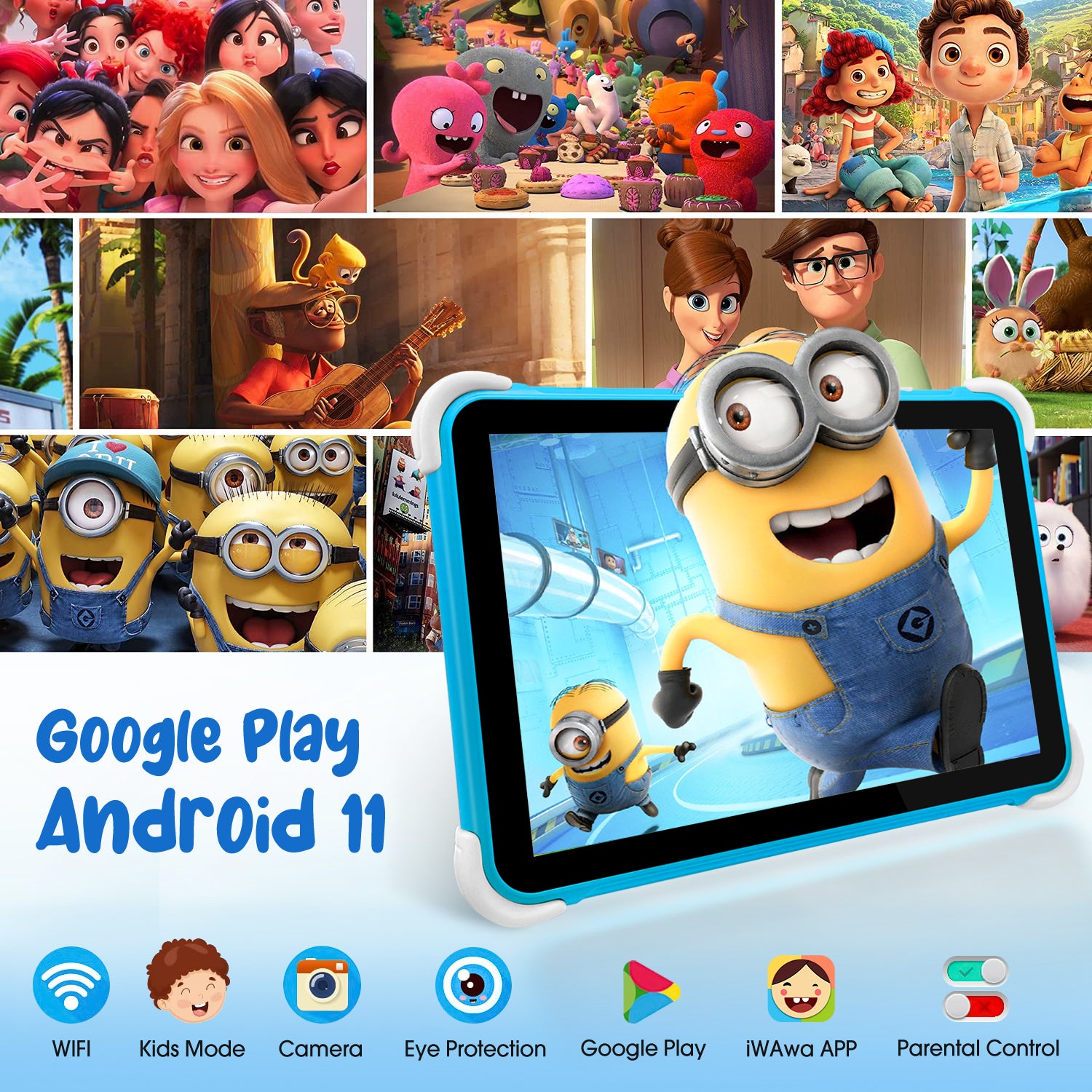 10.1 inch Wifi Android 11 Kids tablet, brand new design, with quad-core processor, HD Touch Screen,enjoy faster transmission speed and watch movies/TV shows or Play games, 2 GB RAM and 64GB ROM with dual cameras, 5.0MP rear, allowing children to capture happy moments when they are inspired, 64GB storage space Built-in, you can enjoy clear video calls, selfies, pictures, videos, and store every wonderful moment,Pre-installed with IWAWA Education Application,parental controls system ,We can also download more apps from the Google Play Store, such as YouTube Kids, Netflix, Hulu, etc. Provide children with a completely reliable and healthy playground.